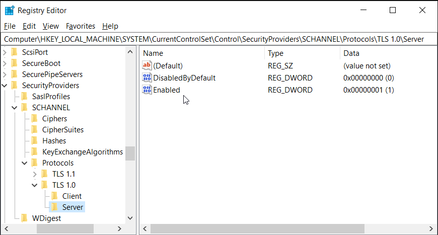 Naviguez jusqu’à HKEY_LOCAL_MACHINE\SYSTEM\CurrentControlSet\Control\SecurityProviders\SCHANNEL\Protocols\TLS 1.n.