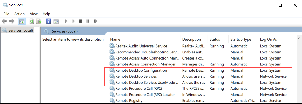 Solution : Ouvrez la console Services Windows, vérifiez que Services Bureau à distance est connecté en tant qu’utilisateur de Service réseau et que les autres services Bureau à distance sont en cours d’exécution.