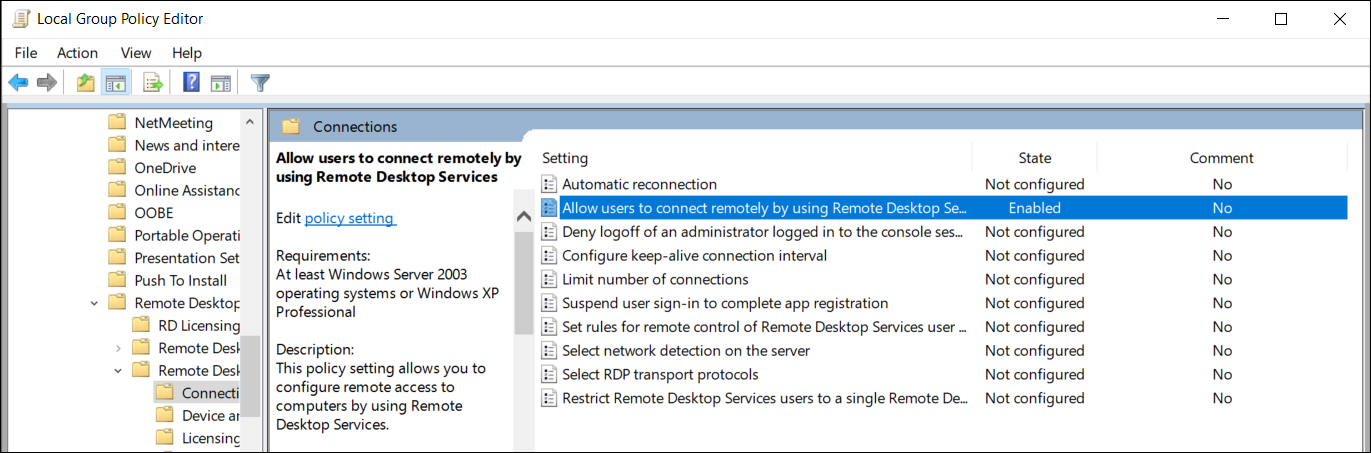 - Autoriser l’ouverture de session par les services Bureau à distance est défini sur Administrateurs.